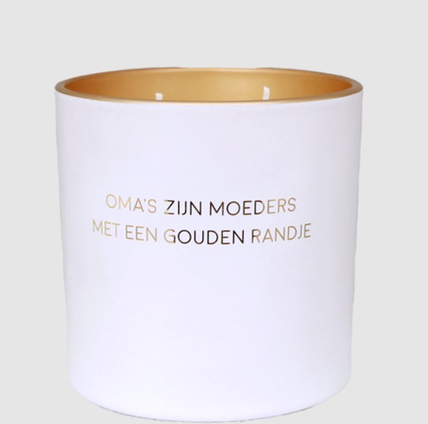 Een heerlijke geurkaars gemaakt van biologische sojawas. Deze kaars heeft de geur Fresh Cotton en brandt ca. 60 uur. Deze sojakaars wordt gesierd met de tekst 'Oma's zijn moeders met een gouden randje'.